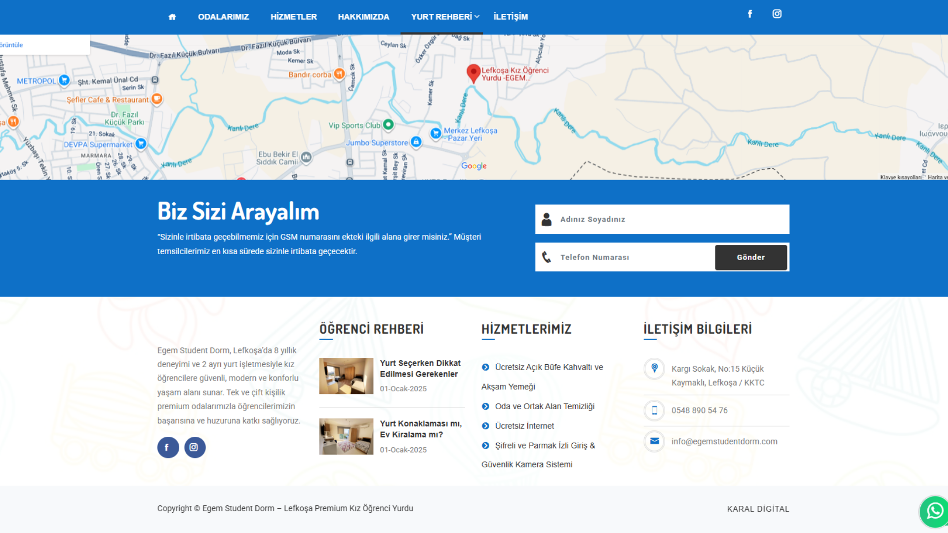 Karal Digital olarak, Kuzey Kıbrıs Türk Cumhuriyeti Lefkoşa’da hizmet veren Egem Premium Student Dorm için modern ve kullanıcı dostu bir web sitesi geliştirdik.